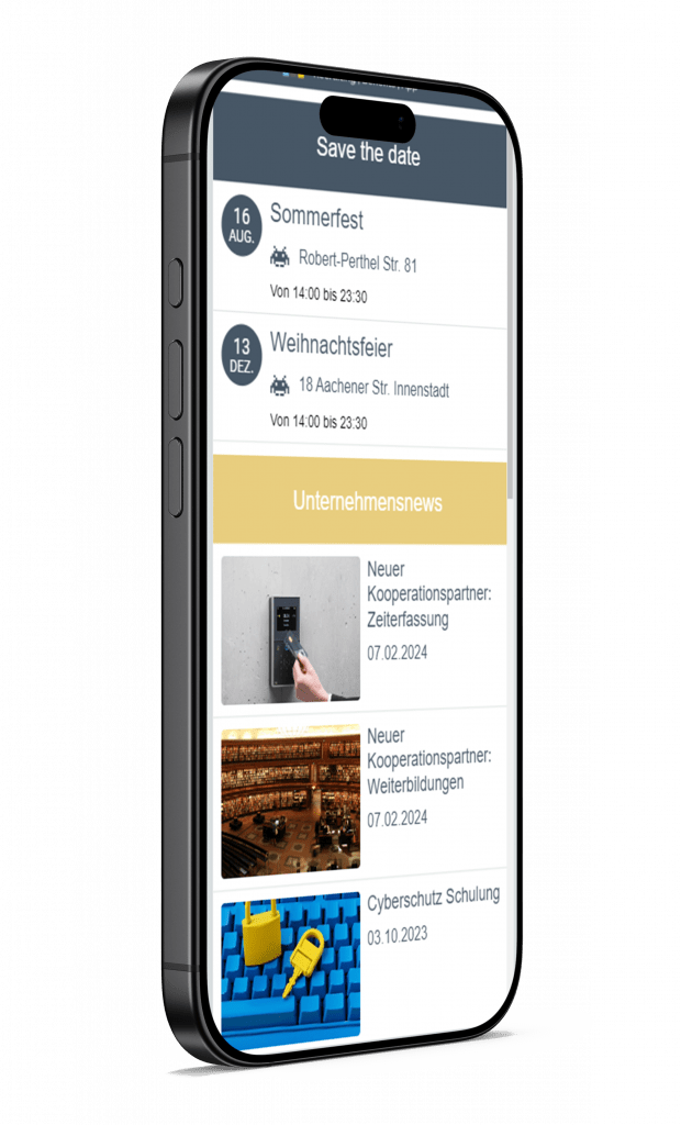 Ganz einfach Mitarbeitende zu Events einladen, per Push-Benachrichtigung erinnern und Unternehmensnews kommunizieren.